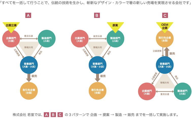 (一) 若狭塗箸の伝統を継承し、磨き続けてきた技術を生かし安心して使える箸を創ります。 (二) 斬新なデザイン・カラーに挑戦し、WAKASATOブランドの売場を演出していきます。 (三) 健全で誠実な夢を持った社員を育成し。御得意先様との信頼関係を構築していきます。